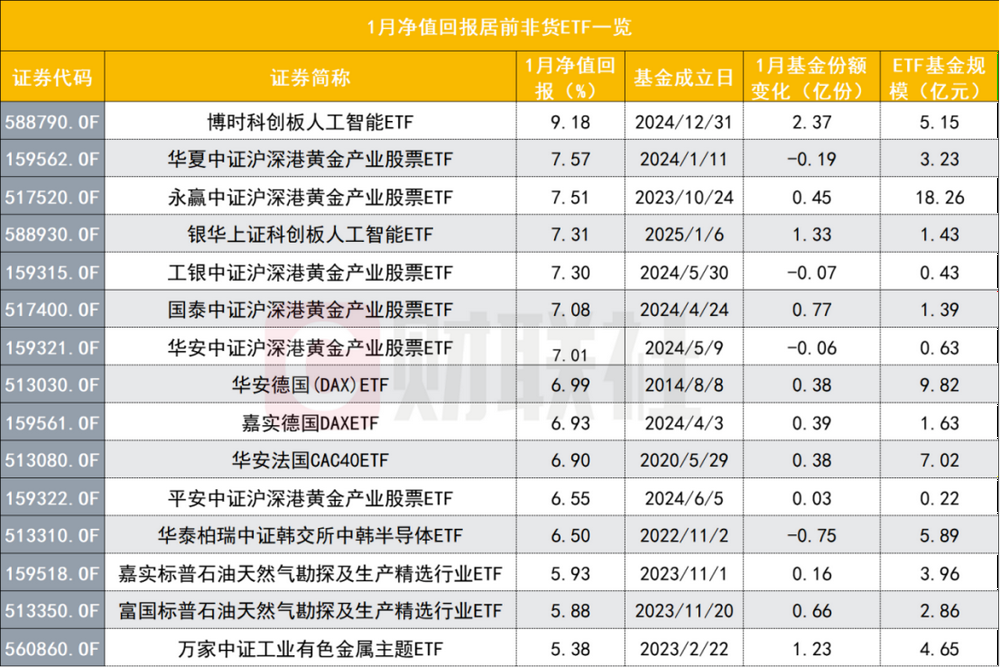 Wind数据显示,截至1月31日,有254只非货ETF在净值回报为正,在所有非货ETF中占比达24.21%。黄金、人工智能主题ETF涨幅居前。
