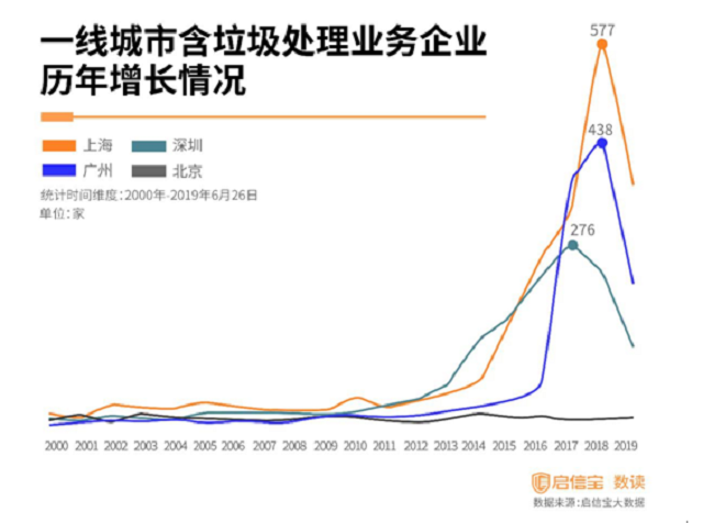 数据显示,一线城市中上海垃圾处理企业的增长最为快速,其次是广州和深圳。