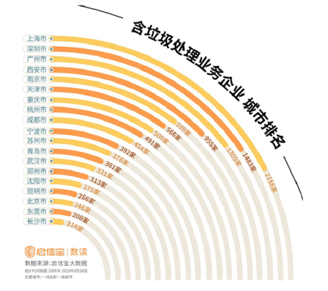 垃圾的分类和处理能力,一定程度也反映除城市治理的能力和决心。通过启信宝数据查询,全国含垃圾处理的企业中,排名前五的分别是上海市(2156家),深圳市(1483家),广州市(1305家),西安市(955家)和南京市(599家)。
