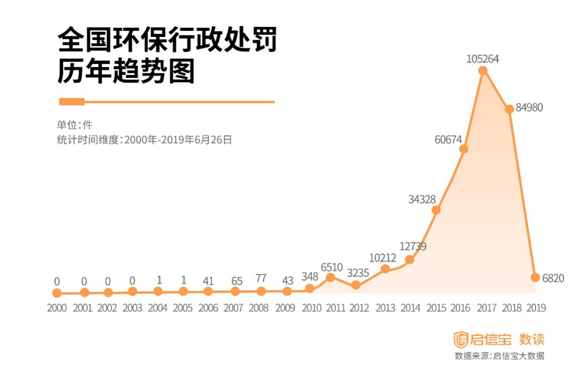 尤其是2011年,全年行政处罚达6510起,较2010年增长了1770.69%。2011年后,每年的环保类行政处罚飞速增长,2017年一年的环保行政处罚突破10万起。