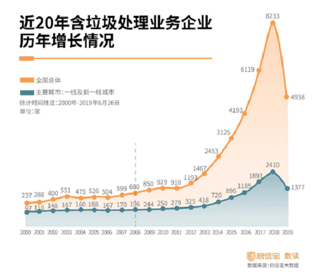 从2000年国家提出,倡导垃圾分类并在全国重点城市推行,然而启信宝数据显示,过往的近20年内,经营范围包含垃圾处理业务的企业数量尽管每年呈递增状况,前十年间始终处于缓慢增长态势。