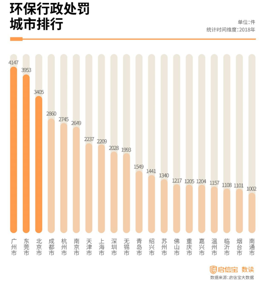 启信宝拉取了这46个城市中,环保行政处罚数据并进行排序。行政处罚排名前十的为广州市、东莞市、北京市、成都市、杭州市、南京市、天津市、上海市、深圳市和无锡市,对于这几座城市而言,垃圾分类的任务更为艰巨,也更为急迫。