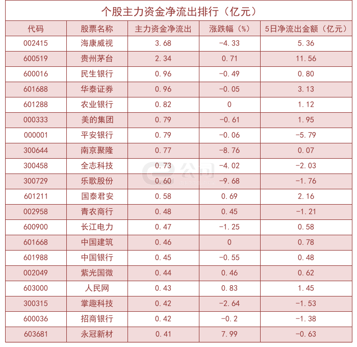 另外,有2只个股主力资金净流出超过亿元。海康威视净流出3.68亿元,位居榜首;贵州茅台紧随其后,尾盘净流出2.34亿元,民生银行、华泰证券净流出资金也在1亿元以上。