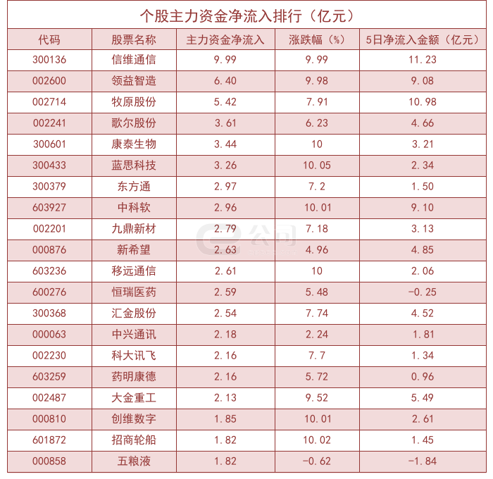 个股方面,共有43只个股主力资金净流入超亿元。主力资金净流入最大的是信维通信,近5个交易日累计净流入11.23亿元,累计涨幅3.60%。领益智造、牧原股份、歌尔股份等主力净流入资金也较多,分别达6.40亿元、5.42亿元和3.61亿元。