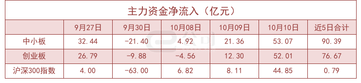 数据统计显示,沪深两市主力资金净流入146.02亿元,分类看,中小板流入53.07亿元,创业板流入52.01亿元,沪深300指数流入44.85亿元。而在此前四个交易日(9月27日-10月9日),两市主力资金流入,分别为43.45亿元、-117.42亿元、16.95亿元、53.22亿元。