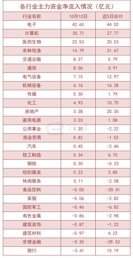 从行业层面看,10月10日,在27个申万一级行业中,电子、计算机、医药生物、农林牧渔、交通运输等行业实现资金净流入,分别为42.63亿元、25.71亿元、22.53亿元、14.79亿元、8.27亿元。在主力资金净流出行业中,银行、非银金融、建筑材料、建筑装饰、有色金属等行业流出金额较大,分别为3.41亿元、3.35亿元、0.97亿元、0.87亿元、0.86亿元。