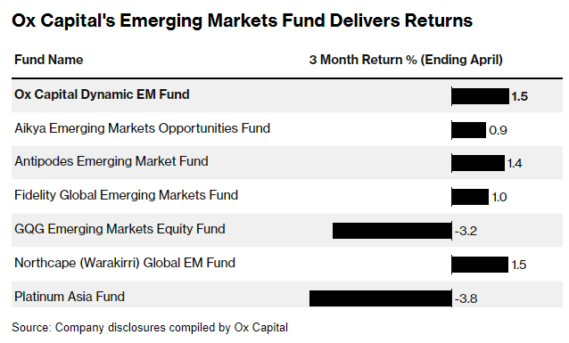 Ox Capital Dynamic Emerging Markets Fund最看好的股票包括中国医疗健康领域的中型股,如骨科植入物制造商爱康医疗(01789)和医疗器械公司微创医疗(00853)。Lai表示,该基金管理着约8亿澳元(5.2亿美元)的资产,截至4月的三个月内回报率达1.5%。