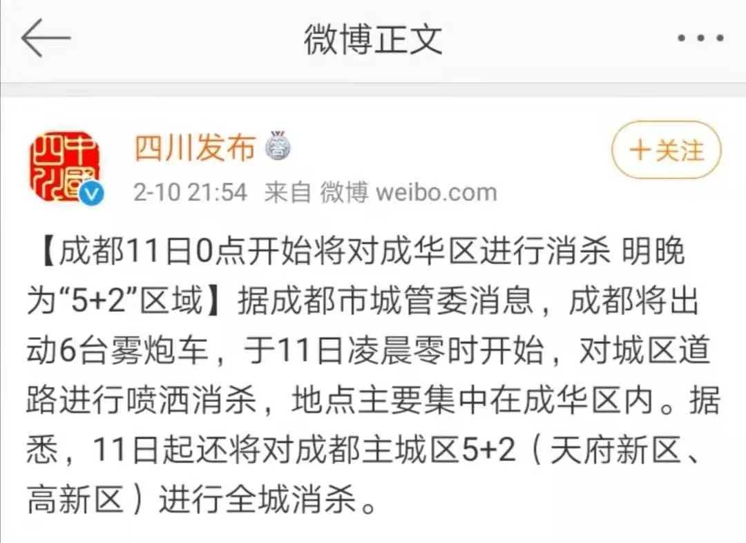 在湖北省以外,部分城市也开始了全城消毒工作。“四川发布”2月10日消息显示,成都出动6台雾炮车于2月11日凌晨零时开始,对城区道路进行喷洒消杀,地点主要集中在成华区内。据悉,11日起还将对成都主城区5+2(天府新区、高新区)进行全城消杀。