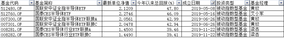 WIND数据显示,今年以来,共有76只基金年内回报超过30%,富国中证工业4.0B、国联安中证全指半导体ETF、国泰CES半导体ETF收益率强势领跑,分别为49.55%、47.80%和46.09%,三者均为被动指数型基金,共有近20只基金回报超过40%。国联安中证全指半导体ETF、国泰CES半导体ETF、国联安中证全指半导体ETF联接A、国联安中证全指半导体ETF联接C等均为2019年5月以来成立的新基金,均为被动指数型基金,瞄准的投资方向均为半导体。另有国泰CES半导体行业ETF联接A、国泰CES半导体行业ETF联接C两只被动指数型基金成立日期为2019年11月,年内回报率分别为39.46%和 39.41%。