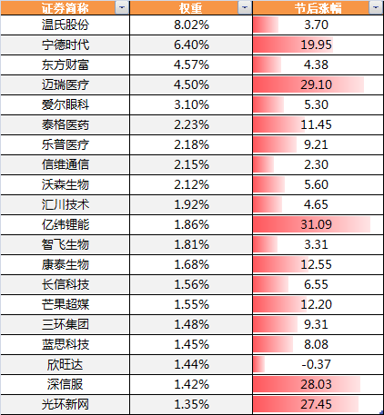 数据显示,目前创业板指数前20大权重股分别为:温氏股份、宁德时代、东方财富、迈瑞医疗、爱尔眼科、泰格医药、乐普医疗、信维通信、沃森生物、汇川技术、亿纬锂能、智飞生物、康泰生物、长信科技、芒果超媒、三环集团、蓝思科技、欣旺达、深信服、光环新网。