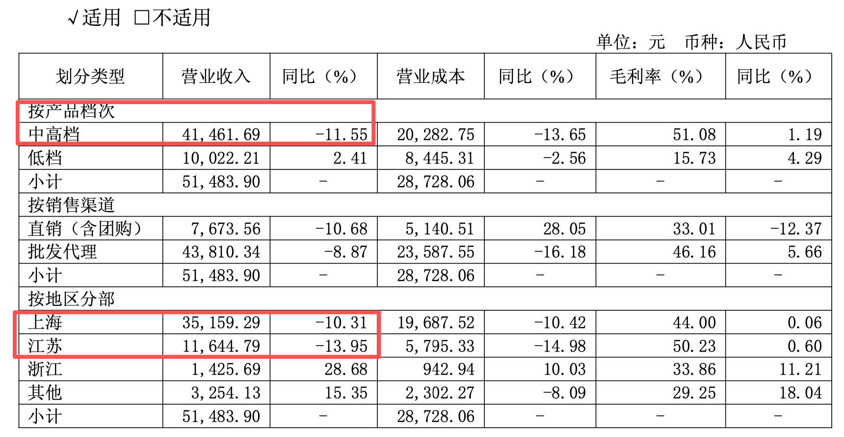 此外,金枫酒业市场呈现“大本营收缩、外埠承压”格局,上海市场作为核心基本盘,2025年实现销售收入3.52亿元,同比下滑超过10%,占主营业务收入比重约68%,市场份额面临本地竞品与外来品牌双重挤压;江苏核心市场收入1.16亿元,同比下滑约14%,本期占比22.62%,渠道渗透乏力;其他省外市场拓展进展缓慢,销售收入合计占比9%左右,仅浙江等少数区域略有增长,全国化布局迟迟未能突破。