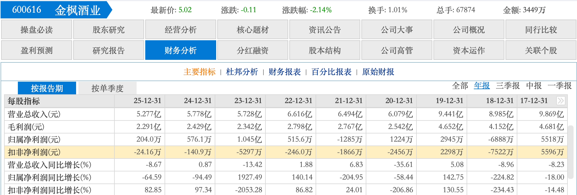 更进一步来看,金枫酒业2025年扣非后净利润为-24.16万元,已深陷连续六年的亏损之中。