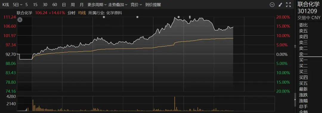 化工板块午后局部拉升,联合化学一度涨逾19%,股价创历史新高;红墙股份盘中涨逾8%,奇德新材、联盛化学等涨幅居前。