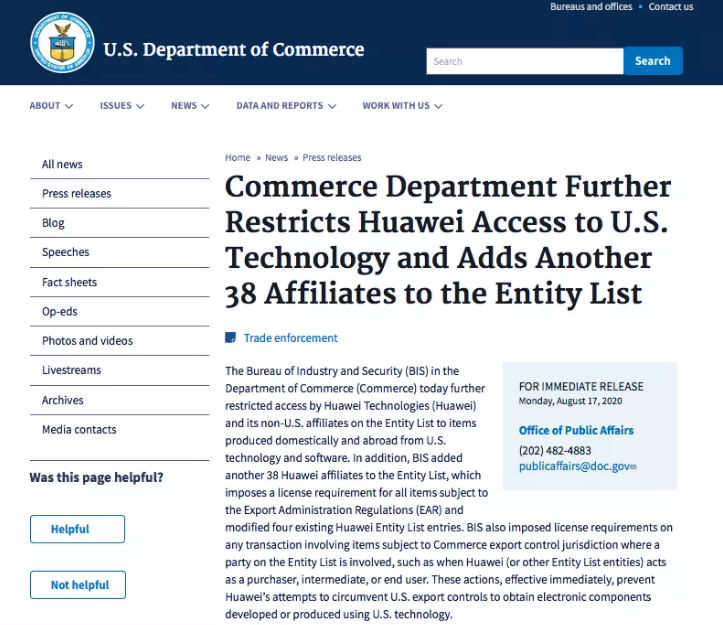 此前,美国曾试图通过“实体清单”切断华为购买美国芯片等关键零部件,目前该实体清单已于8月14日正式生效,另外,今年5月美国再升级对华为限制,拟阻断台积电为华为代工芯片,按照规定,9月14日以后台积电将无法继续为华为代工生产芯片。
