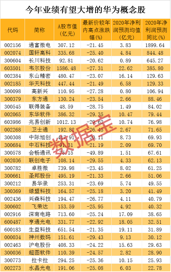 在这些大幅回调的华为概念股中,有不少公司今年业绩值得期待。数据显示,根据5家以上机构一致预测数据,有30只华为概念股2020年净利润有望同比增长10%以上,且昨日收盘价较年内高点回调20%以上,这其中包含2只千亿市值科技龙头,分别是韦尔股份、兆易创新。