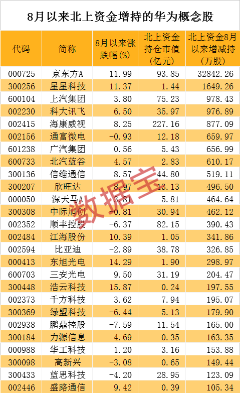 北上资金近期也在频频加仓华为概念股。数据显示,8月以来京东方A、星星科技、上汽集团、科大讯飞、海康威视、通富微电等股获北上资金增持500万股以上。京东方A获北上资金增持3.28亿股居首,北上资金持仓市值达到93.85亿元。