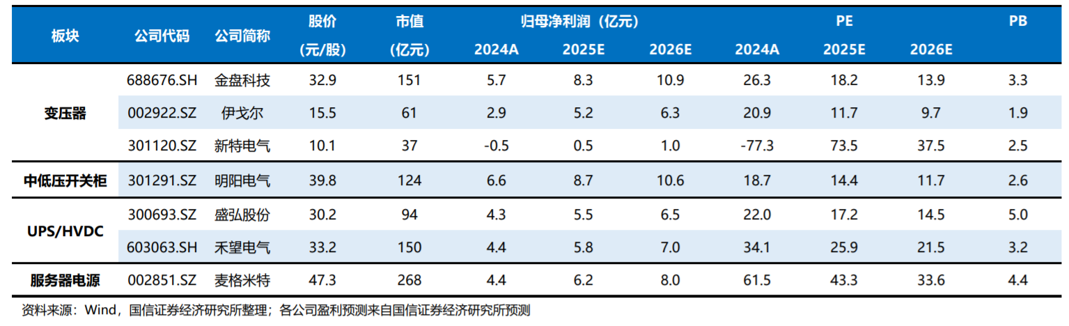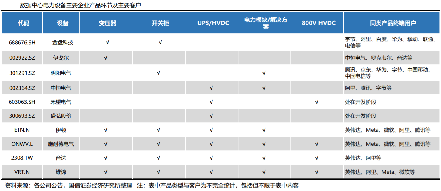 变压器方面,金盘科技、伊戈尔已向行业头部客户供货。开关柜方面,金盘科技、明阳电气已向行业头部客户供货。UPS/HVDC方面,UPS主要供应商包括华为、科士达、维谛、易事特、施耐德、科华、伊顿、台达等;HVDC供应商主要为中恒电气、台达、维谛3家企业,盛弘股份、禾望电气、麦格米特也在布局HVDC领域。