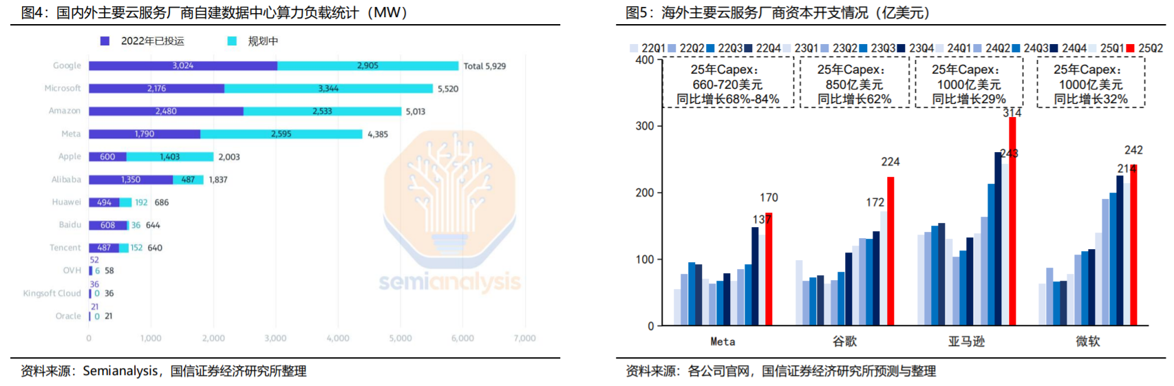 海外四大云厂2025年资本开支将持续增长,预计将超过3500亿美元,同比增长约46%,且投资将主要用于服务器、数据中心和网络基础设施,有望促进AI基础设施产业链景气度持续向上: