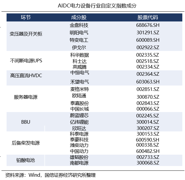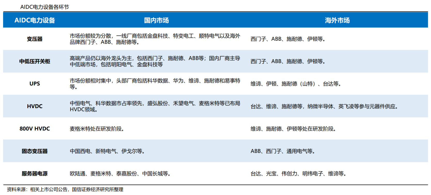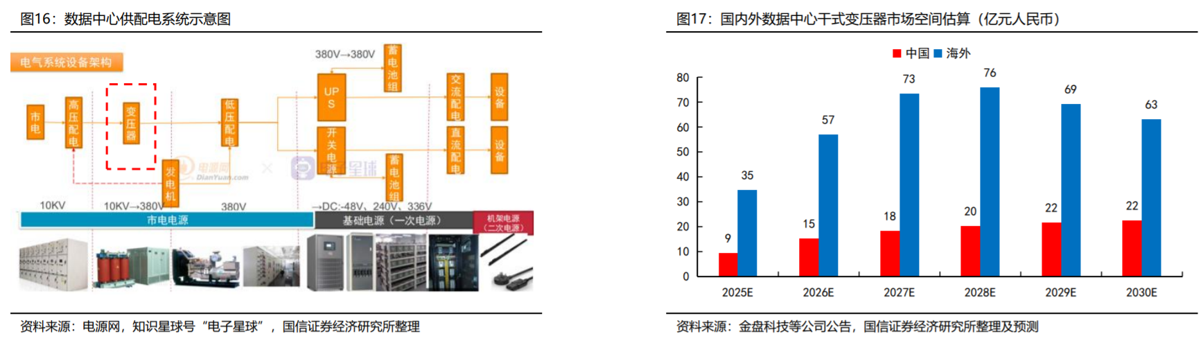 AIDC电力设备:1)变压器/开关柜环节;2)UPS/HVDC环节;3)有源滤波器APF环节;4)服务器电源环节。核心公司:金盘科技、明阳电气、伊戈尔、禾望电气、盛弘股份、蔚蓝锂芯。