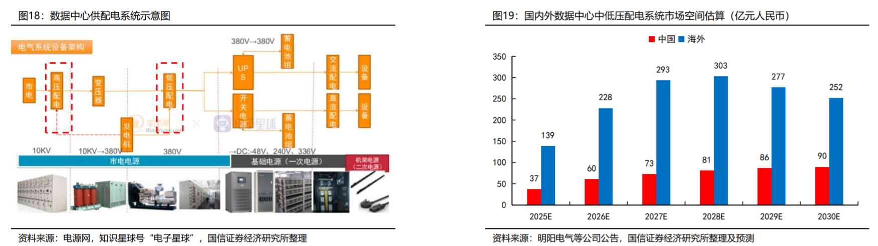 一般数据中心中低压配电系统单位价值量在4-6亿元/GW(电力设备口径)附近,我们预计2025-2030年国内数据中心中低压配电系统市场空间分别为37/60/73/81/86/90亿元,海外数据中心中低压配电系统市场空间分别为139/228/293/303/277/252亿元。