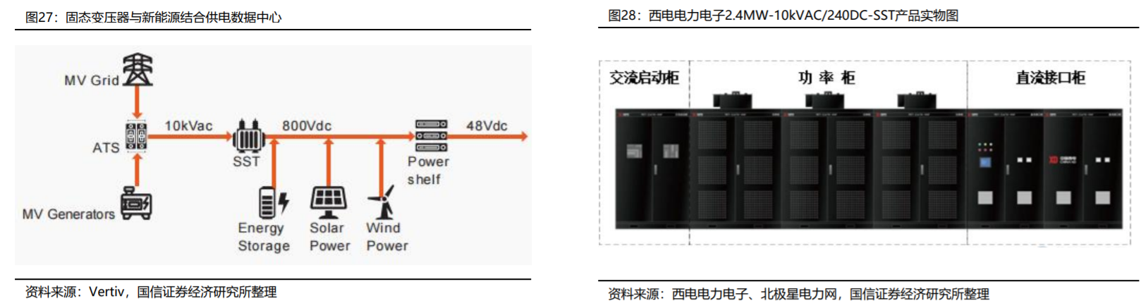 目前,国内华为、京东以及西电电力电子积极推进SST在数据中心的应用。华为与京东云合作推出华为数字能源与京东云联合推出的一体化供电方案SST,供电效率高达95.3%;西电电力电子推出基于SST技术的数据中心中压直供直流电源产品,传输效率大于97.5%。根据公司公告,新特电气等变压器企业也在进行固态变压器产品的开发。