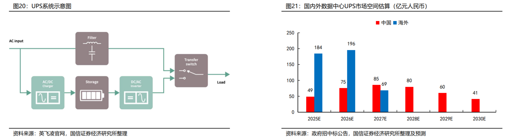 一般数据中心UPS单位价值量在5-8亿元/GW(电力设备口径)附近,我们预计2025-2030年国内数据中心UPS市场空间分别为49/75/85/80/60/41亿元;2025-2027年海外数据中心UPS市场空间分别为184/196/69亿元,后续随着AIDC的建设对电源系统的要求变化,UPS的份额将逐步被高压直流的技术路线替代。