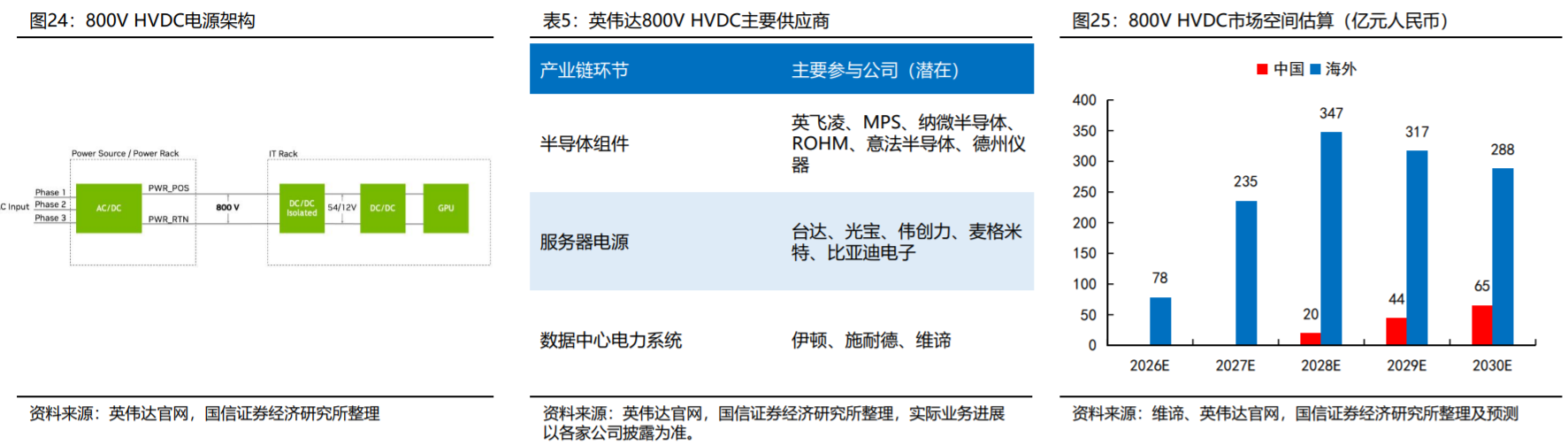由于海外电网稳定性较差、停电频率较高,欧美数据中心运营商对于800V HVDC的需求较国内更加迫切,我们预计800V HVDC产品将首先在海外市场推广。在传统HVDC基础上,预计800V HVDC电源单位价值量约4-6亿元/GW(电力设备口径),预计2026-2030年海外市场空间分别为78/235/347/317/288亿元;到2028年国内800V HVDC产品市场空间有望达到20亿元。