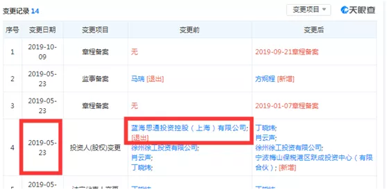 不过天眼查数据显示,2019年5月,徐工蓝海出现股权变更,蓝海思通退出,宁波梅山保税港区跃成投资中心(有限合伙)取而代之。