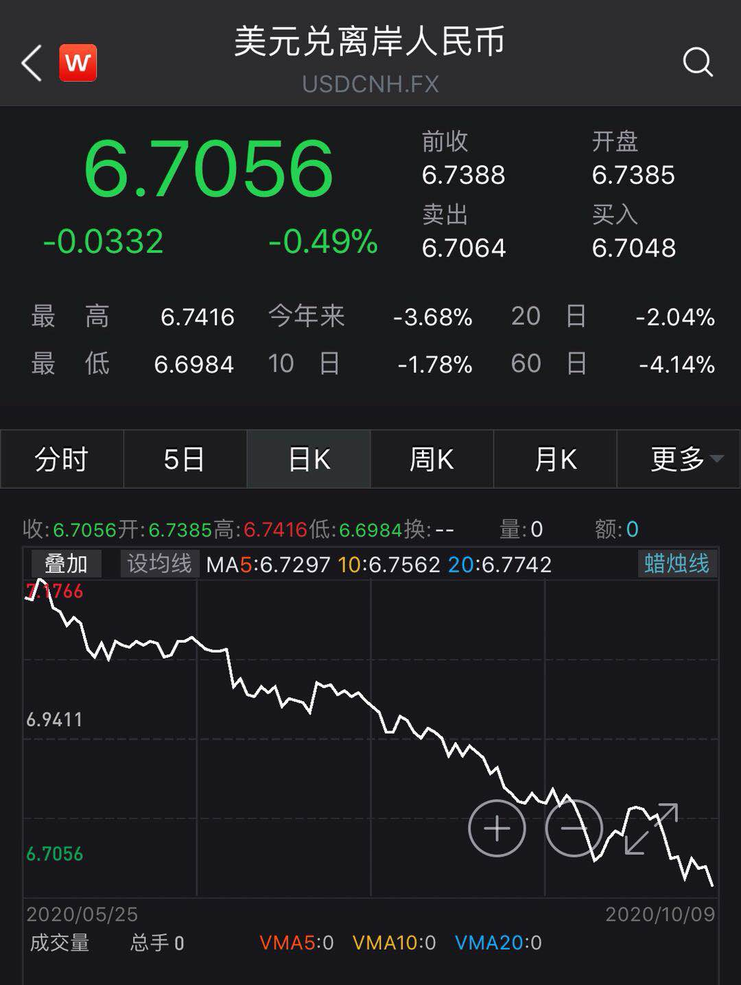 10月9日,在岸人民币对美元汇率盘中飙升逾1000点,夜盘最高升破6.70关口,创下去年4月以来新高。在岸人民币汇率的如期飙升,主要受益于假期期间,离岸人民币对美元汇率持续上涨,使得在岸与离岸的汇差高达600余点。