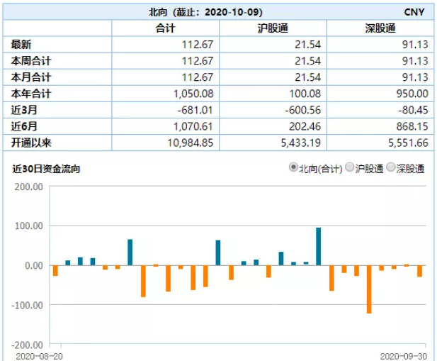 此外,Wind数据显示,10月9日北向资金早盘单边涌入,午后深股通高位横盘,沪股通则有所回落,全天北向资金大幅净买入112.67亿元,单日净买入额创7月6日以来新高;其中深股通净买入91.13亿元,创4月14日以来新高。