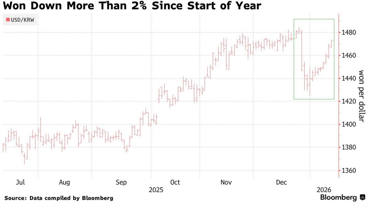 受拉美和中东地缘政治局势紧张以及美国经济数据强劲的支撑,美元持续走强,这已基本抹去了韩元在 2025 年底录得的涨幅。与此同时,韩国国内对海外资产的需求依然坚挺,而外国投资者继续净卖出韩国股票。