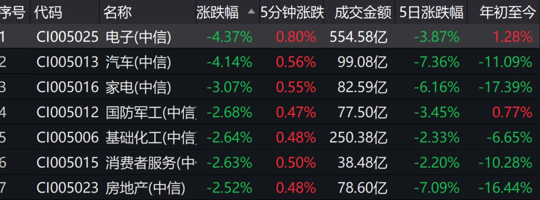 从盘面上看,市场几乎所有板块悉数下跌,电子、汽车、家电等板块跌幅居前,均超4%以上。而医药板块则相对抗跌,午盘收盘,收涨0.13%左右。