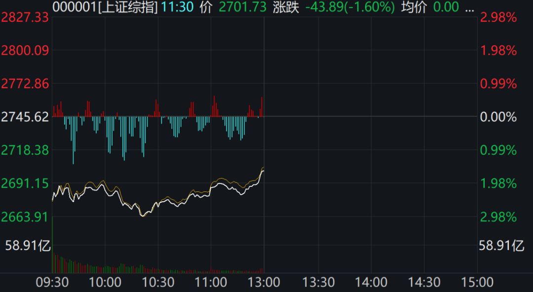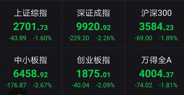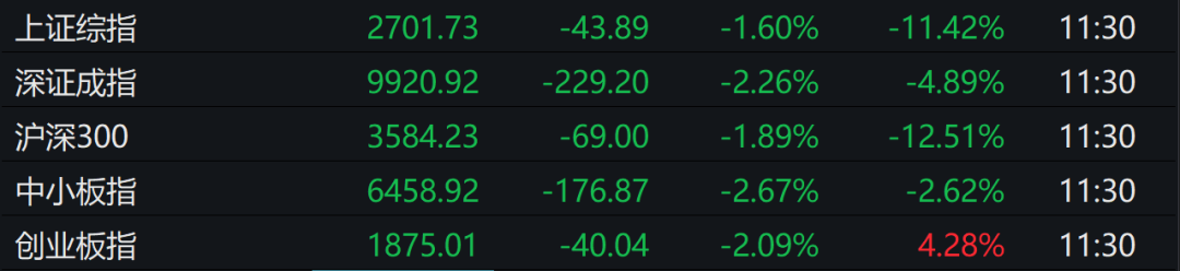 3月23日开盘,A股三大指数集体低开,沪指再度失守2700点,盘中跌幅超2.5%,截至午盘跌幅收窄,跌1.6%;深证成指低开3%;创业板指数盘中一度跌超4%。截至午盘收盘,三大指数悉数收跌。