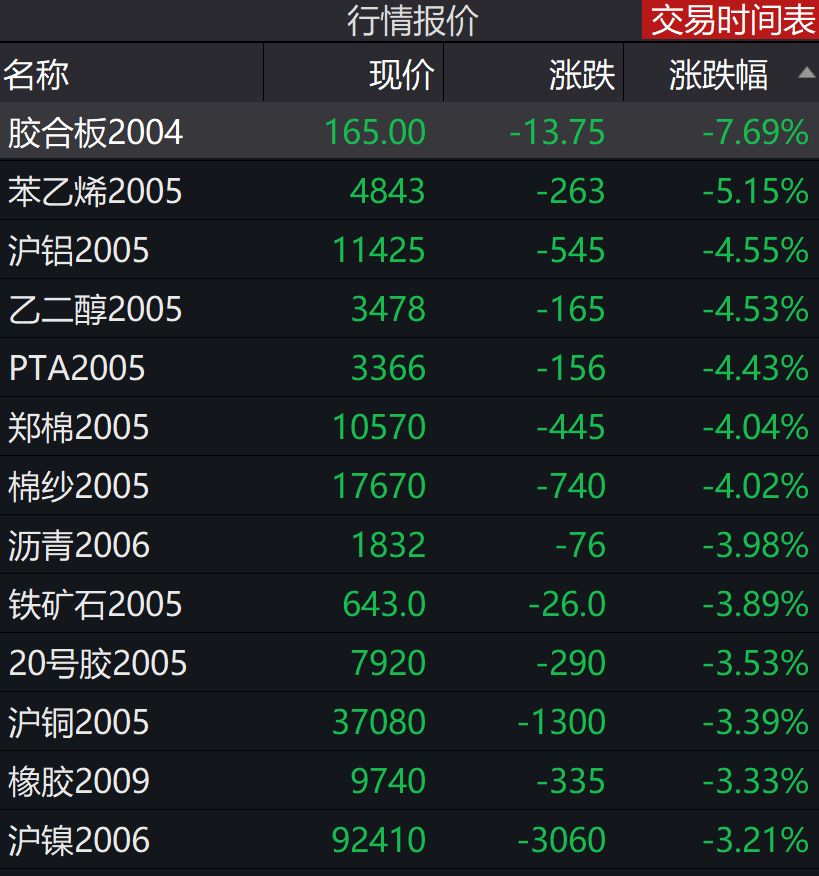 而在国内,期市开盘普跌,能化、有色、农产品等几乎所有板块全体沦陷。其中原油跌超11%,沥青跌近7%。沪铜、棉花期货主力合约跌停。随后PTA、乙二醇期货跌停,跌幅分别为5.05%及5.00%,同样触发跌停。截至午盘,各类品种跌幅略有收窄。