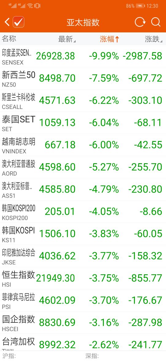 各国股市开盘先后开启比惨模式:新西兰股市指数盘中跌超10%、澳洲股市跌幅重挫超8%、韩国三大股指期货悉数触发熔断。据标普最新预计,新冠疫情造成亚洲及太平洋地区经济损失6200亿美元。