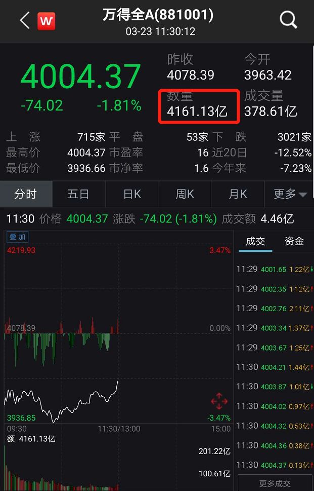 值得注意的是,近期股市跌幅迅猛,A股成交量也开始出现了明显萎缩。3月23日上午,沪深两市成交仅为4000多亿元。
