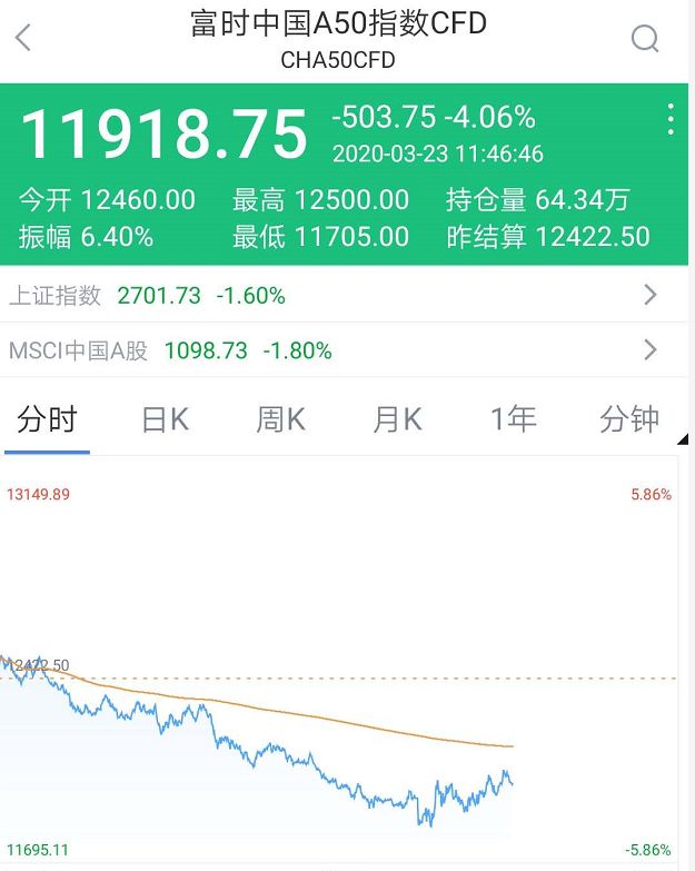 富时中国A50指数开盘大跌超5%以上。截至11点50分左右,指数仍然跌超4%以上。
