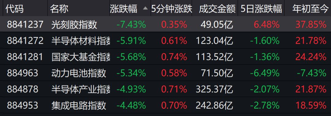 而此前受资金追捧的各类题材和概念股也快速下跌,光刻胶盘中指数跌超8.9%。
