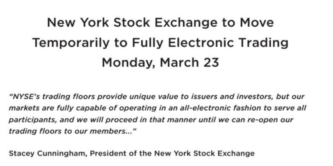纽约证券交易所总裁StaceyCunningham称,“我们的市场完全有能力以全电子方式为所有参与者提供服务,我们将以这种方式前进,直到我们可以向会员重新开放交易大厅为止。”即,这将成为纽交所227年历史上,首次在关闭交易大厅的情况下维持市场交易。
