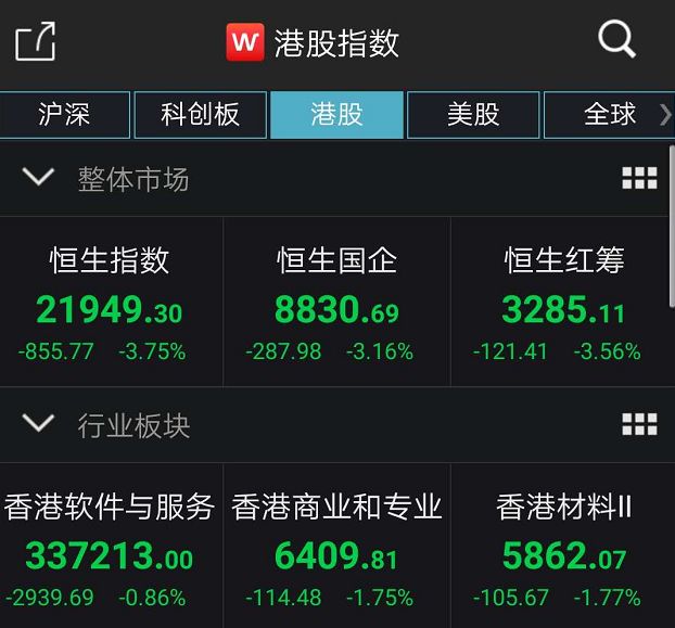 香港恒生指数开盘跌5.02%,舜宇光学科技跌逾8%,腾讯控股、阿里巴巴跌逾5%。中国恒大开盘跌超16%,公司预期2019年核心净利润较去年下降约48%。临近午盘收盘,恒指仍然跌超3.74%。