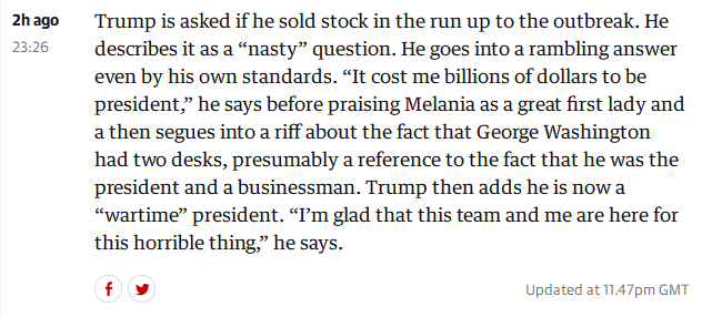 据英国《卫报》文字直播,特朗普回答时表示,自己没有股票,他还形容这是一个“让人讨厌但确实值得问的问题”。《卫报》说,特朗普然后就开启了“聊闲篇”模式,表示“当总统耗费了我数十亿美元”。他还补充说,自己现在是一位“战时”总统,“很荣幸这个团队和我站在这里面对这么可怕的事情”。