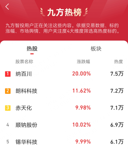 九方热榜:纳百川,朗科科技,赤天化,顺钠股份,锡华科技