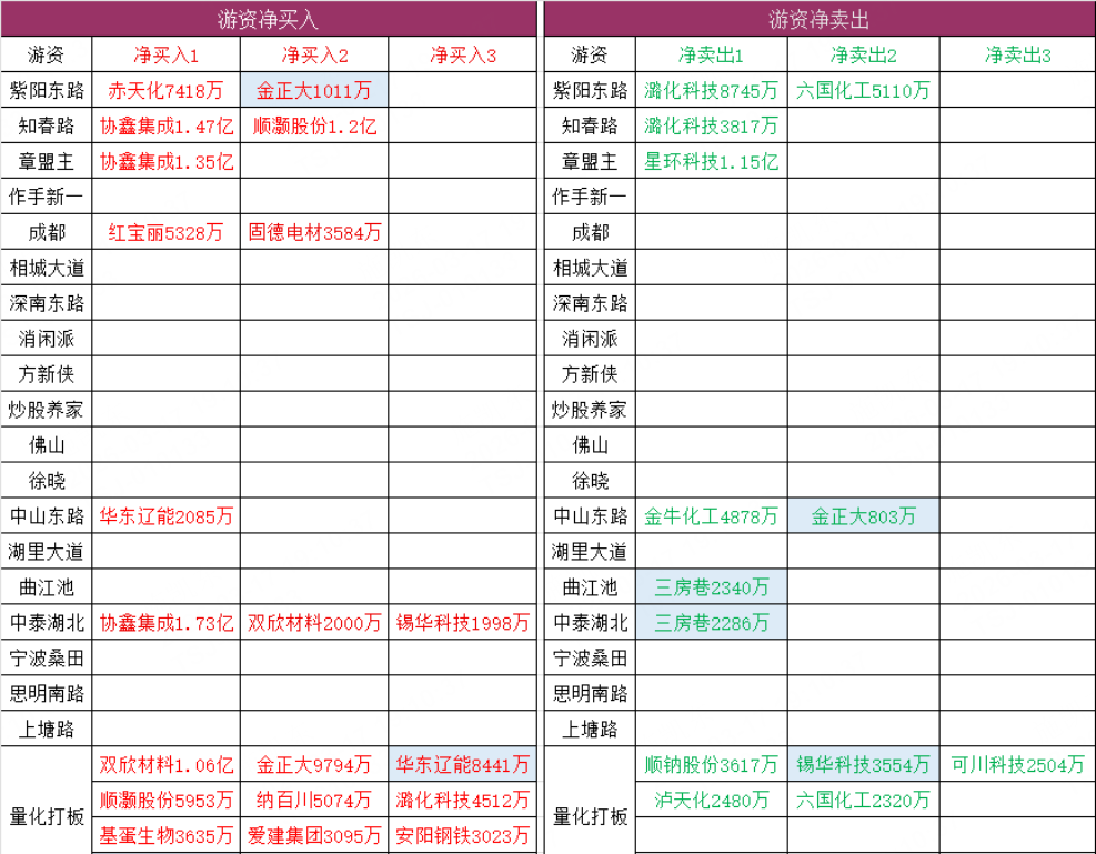 点评:昨天化工低开高走,量化反核,从龙虎榜上看量化高抛低吸做的不亦乐乎。这个板块上午走的符合预期低开高走以后横盘震荡温和换手,但临近尾盘量化一波疯抢感觉有点逼空高潮的意味在里面了,有点像上周四尾盘电力板块乱抢筹的感觉,今天的话灵活应对,看有没有新的低位首板出现稳住板块,如果没有的话,小心会复制电力板块后面2天的走势!昨天尾盘主要抢的是一些情绪票,真正受益会提振业绩的宝丰能源,百川股份,红星发展这种反而没怎么跟,这里看下会不会修复。金牛化工目前就是电力板块的豫能控股的角色,它只要不杀跌跌停,对板块就没有那么大负面影响,维持在5均,打弹性就交给其他新面孔即可。
