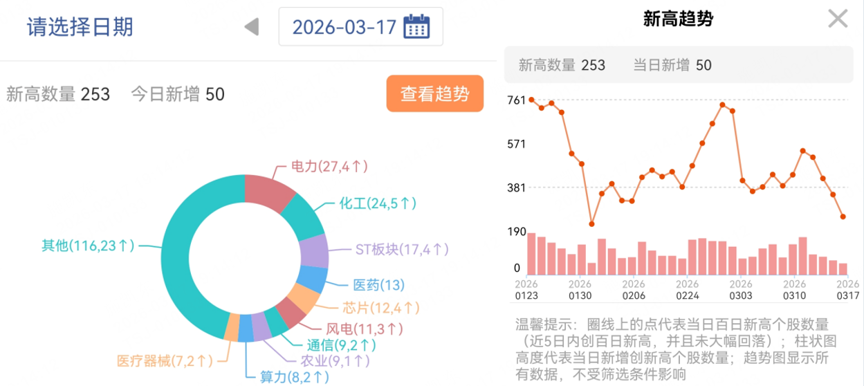 从百日新高去看,板块新高数量前4:电力>化工>ST板块>医药