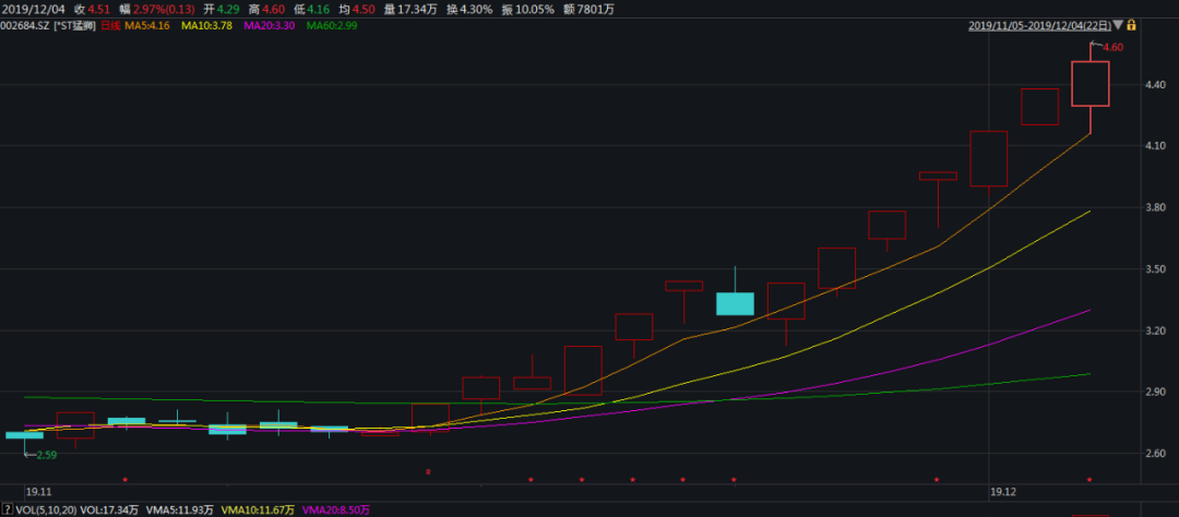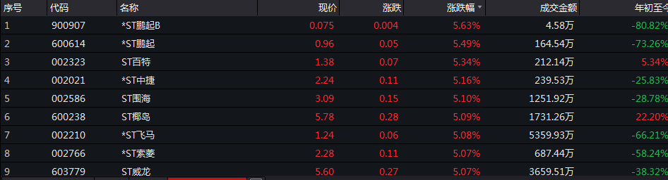 在这10多只涨停的ST股中,不少个股已连续多日涨停。其中*ST中捷已实现8连板,股价过去8个交易日累计上涨48.3%。*ST猛狮盘中一度触及涨停,之后有所回落,收盘上涨近3%,最新股价4.51元,较11月25日的收盘价上涨37.9%。事实上,在近10个交易日中,*ST猛狮已录得9个涨停。