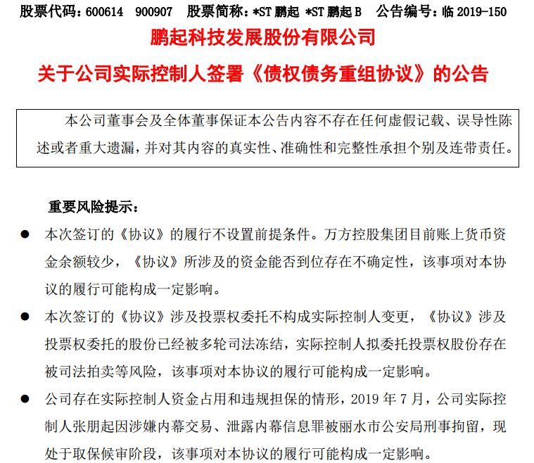 以连续两个交易日涨停的*ST 鹏起为例,正是受到实控人签署债权债务重组协议的影响。此前*ST鹏起已连续15个交易日“破面(指股价低于1元)”。按规定,如果后一周继续破面,公司股票将被退市。