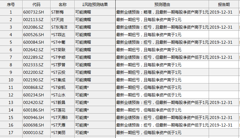 由于ST、低价股的基本面情况良莠不齐,盲目跟炒风险较大,从业绩角度加以甄选尤为必要。据Wind风险预测显示,17只个股2019年度公布以后,有望摘帽或摘星。