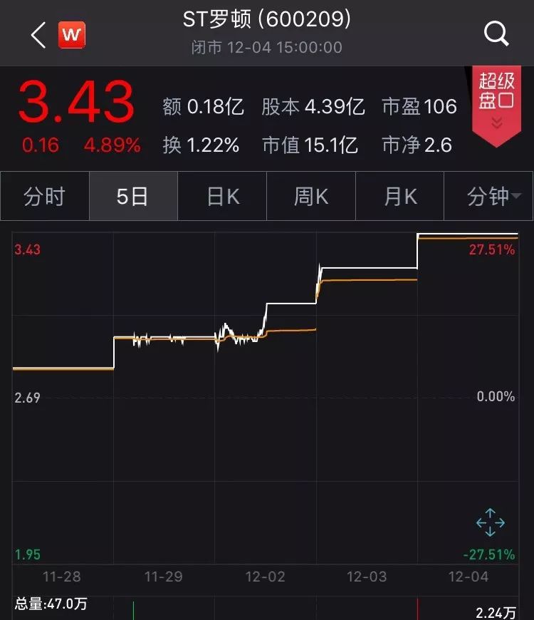 ST罗顿股价继续录得涨停,收盘报3.43元,对应市值15.1亿元。自11月28日开始,ST罗顿已经连续5个交易日获涨停,累计涨幅27.5%。