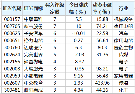 83股获机构买入型评级 中联重科、新宝股份关注度最高