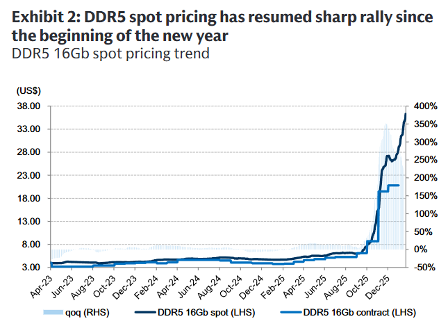 高盛的最新渠道调查显示,与去年12月合约价相比,DDR5/DDR4现货价格分别溢价76%/172%,推动了近期合同价格的上涨以及整个行业的乐观情绪。